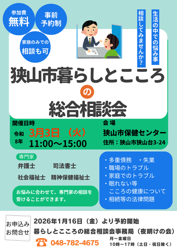 「暮らしとこころの総合相談会」事務局(夜明けの会)電話:048-782-4675に申し込み