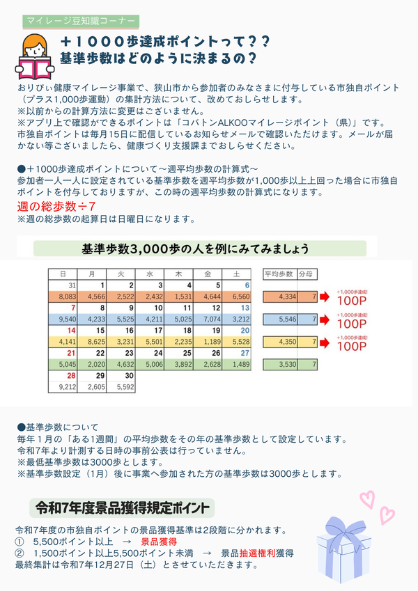 おりぴぃ健康マイレージ事業で、狭山市から参加者のみなさまに付与している市独自ポイント(プラス1,000歩運動)の集計方法について、改めておしらせします。