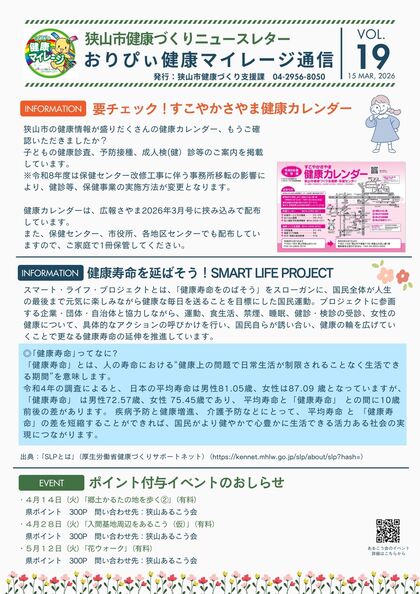 健康カレンダーは、広報さやま2026年3月号に挟み込みで配布しています。