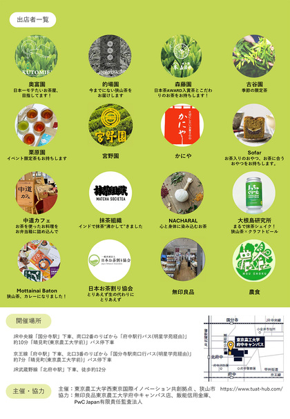 このイベントは、東京農工大学が開催しているNOKOマルシェの番外編として開催されるもので、狭山茶の魅力を広く知っていただくとともに、茶産業活性化に向けたヒントを生産者と生活者がともに楽しく探っていくためにマルシェという形で実施しました。