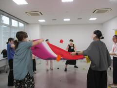 あそびながら自己紹介とゲームで和やかに始まり、わらべ歌あそび、ハンカチあそびで五感を使い体を動かしてあびました。