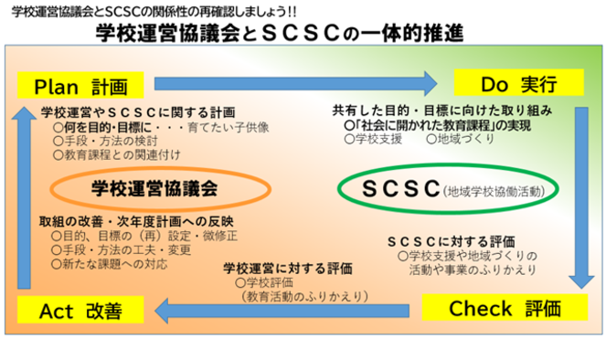 ■学校運営協議会とSCSCを一体的に推進するということは、学校運営協議会とSCSCをPDCAサイクルの中に位置づけて進めていくことと言えます。