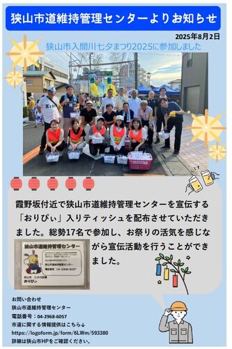 霞野坂付近で狭山市道維持管理センターを宣伝する「おりぴぃ」入りティッシュを配布させていただきました。総勢17名で参加し、お祭りの活気を感じながら宣伝活動を行うことができました。