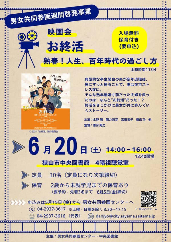 男女共同参画週間の啓発事業として、終活をテーマに男女が共に歩んでゆくヒューマンコメディ映画「お終活 熟春!人生、百年時代の過ごし方」(日本語字幕付き)の上映会を行います。