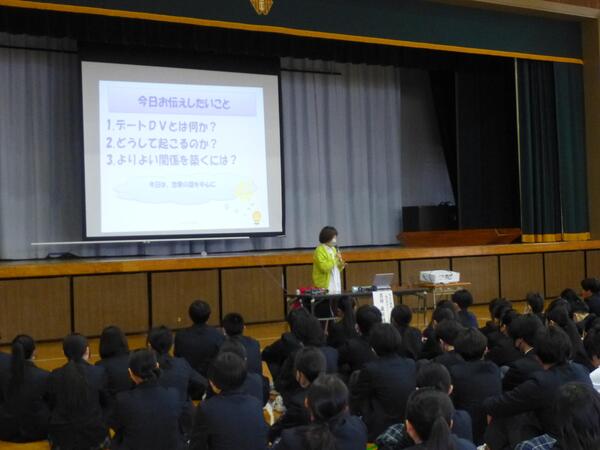講師である一般社団法人エープラス代表理事の 吉祥 眞佐緒さんから、デートDVやジェンダーバイアス、友達へのサポートの仕方等についての話を聞き、被害者にも加害者にもならないために「互いに相手を尊重する関係を築き、個人の尊厳を傷つける暴力は許されないという意識を持つことが必要」という言葉に、参加者は熱心に聞き入っていました。