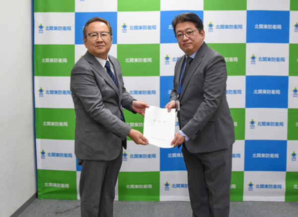 左から、狭山市基地対策協議会岩崎会長、防衛省北関東防衛局企画部長