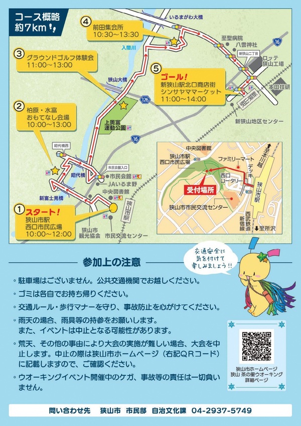 コース:狭山市駅西口市民広場(受付会場)→ →柏原・水富会場(入間川河川敷)→前田集会所 →新狭山北口商店街 →新狭山駅