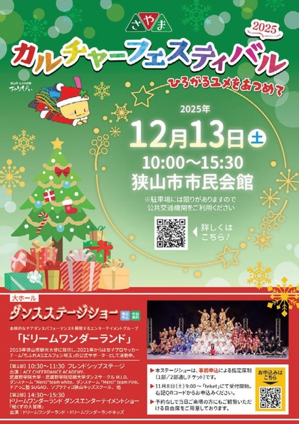 狭山市市民会館を貸し切って、様々なカルチャーを体験できるイベント「さやまカルチャーフェスティバル2025」を開催します!狭山市観光大使を務める「ドリームワンダーランド」や「Bau de Musica(バウ・ジ・ムジカ)」によるステージイベントのほか、タンブラー制作やオリジナルコースター作りなどの様々なワークショップを実施します。