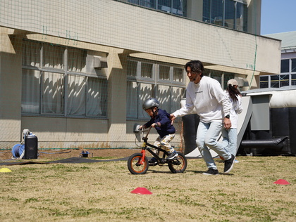 BMX元全日本チャンピオンで狭山市出身の安達浩樹さんとライダーによる催しを春フェスタ狭山台で開催しました。体験の参加者は勢いよく自転車をこぎ出し、コース上の起伏や障害物をクリア。風を切って進む爽快さを感じていました。