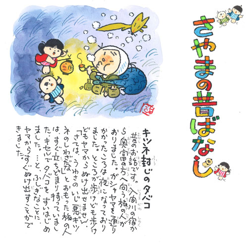 「さては、うわさのいじ悪ギツネのしわざだな」とおもった旅の人は、すぐ立ちどまり持っていましたキセルでタバコをすいはじめました。