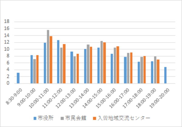 グラフは、各期日前投票所における時間帯別投票者数を、期日前投票者数で除した数をパーセントで表示しています。