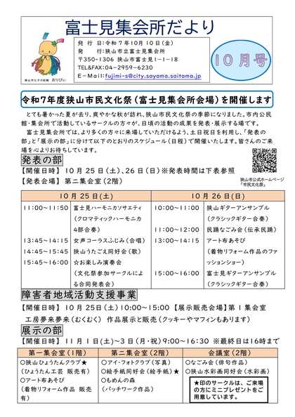 2025年10月号は、令和7年度市民文化祭(富士見集会所会場)についてのお知らせを掲載しています。今年度も、発表の部と展示の部を日にちを分けて実施します。また、新たに障害者地域活動支援事業として「工房夢来夢来(むくむく)」の作品展示と販売も行いますので、皆さん是非ご来場ください。裏面では、9月に行われた第4回小学生ふれあい教室「折り紙」と第1回人権セミナー「インターネットと人権」についての記事を掲載しました。人権セミナーに参加希望の方は、第5回までありますので、富士見集会所までお問合せください。