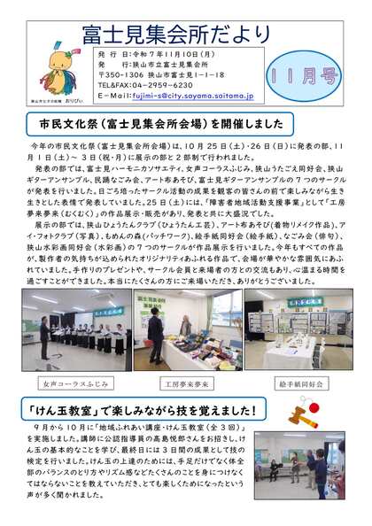 2025年11月号は、10月25日・26日と11月1日から3日まで実施した、狭山市民文化祭(富士見集会所会場)について掲載しています。今年は、発表と展示の2部制となり、様々なサークルの参加と、障害者地域活動支援事業として「工房夢来夢来(むくむく)」の作品展示・販売もあり、多くの方にご来場いただきました。さらに「地域ふれあい講座・けん玉教室」、裏面には「第5回小学生ふれあい教室」「第2回人権セミナー」の様子を写真とともに載せました。富士見集会所では、このように地域の皆様が参加できる様々な催しを実施しています。ご興味のある方は、富士見集会所までお問合わせください。
