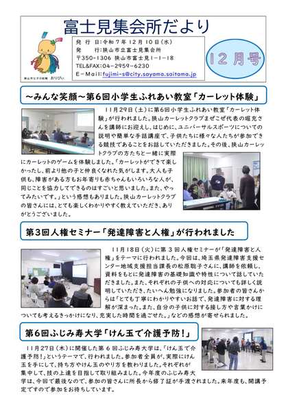 2025年12月号は、11月に実施した第6回小学生ふれあい教室「カーレット体験」、第3回人権セミナー「発達障害と人権」、第6回ふじみ寿大学「けんの玉で介護予防!」の三つの講座について掲載しています。それぞれの講座で、参加者の皆さんが体験したり、講師の話を聞いていく中で、人とのつながりや人権についての知識や理解を深めたり、楽しみながら新しいことを学ぶ様子について紹介しています。裏面では、「教職員人権研修」と「小学生人権学習」についての内容を載せてあります。富士見集会所では、このように様々な事業で、地域の方々に人権教育や学びの場を提供していますので、皆さんぜひご参加ください。
