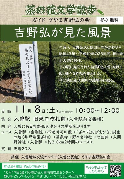 入曽駅→金剛院→不老川河川敷→「茶の花おぼえがき」誕生の地(井戸端園茶畑)→常泉寺→野々宮神社→七曲井→入間野神社→入曽駅