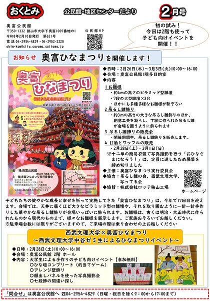 【お知らせ】「第17回奥富ひなまつり」を開催します、【募集】特別な衣装で写真撮影!「おひなさまになろう!」参加者募集、【募集】普通救命講座開催、いざという時のために!<成人の方>《終了証あり》、【募集】笑って元気に、健康に!「おくとみ茶話会」を開催します、【お知らせ】2月16日(月曜日)に奥富公民館で市・県民税申告を受け付けます、【お知らせ】狭山特別支援学校狭山清陵分校が「お米パン」を販売します、【お知らせ】2月2日(月曜日)から地区センターの窓口受付時間が変更になります、【お知らせ】奥富公民館2月の休館日・夜間休館日