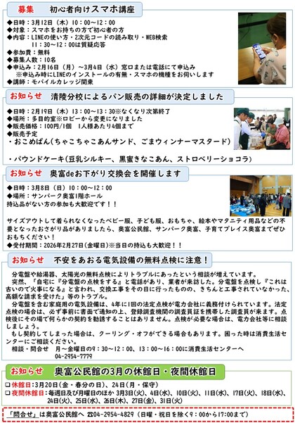 【お知らせ】奥富ひなまつりを開催します!、【募集】初心者向けスマホ講座、【お知らせ】清陵分校によるパン販売の詳細が決定しました、【お知らせ】奥富deお下がり交換会を開催します、【お知らせ】不安をあおる電気設備の無料点検に注意!、【お知らせ】奥富公民館の3月の休館日・夜間休館日