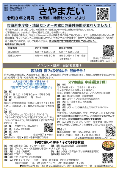 受付時間変更のお知らせ、第16回春フェスタ狭山台開催予告、スマホ講座中級編参加者募集、平和への祈り朗読会「絵本でつなぐ平和への願い」参加者募集、料理で楽しく学ぶ!子ども料理教室参加者募集