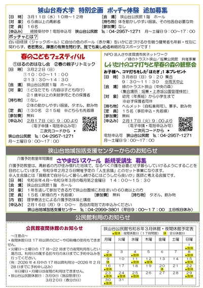 狭山台寿大学特別企画「ボッチャ体験」参加者募集、春のこどもフェスティバル参加者募集、しいたけのコマ打ちと早春の森の観察会参加者募集、介護予防教室さやまだいスクール新規受講生募集、公民館利用のお知らせ
