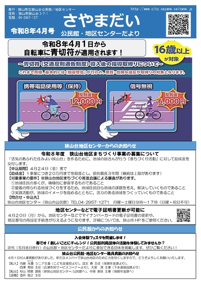 自転車に青切符、令和8年度狭山台地区まちづくり事業の募集について、地区センターなどで電子証明書更新が可能に、職員異動のお知らせ