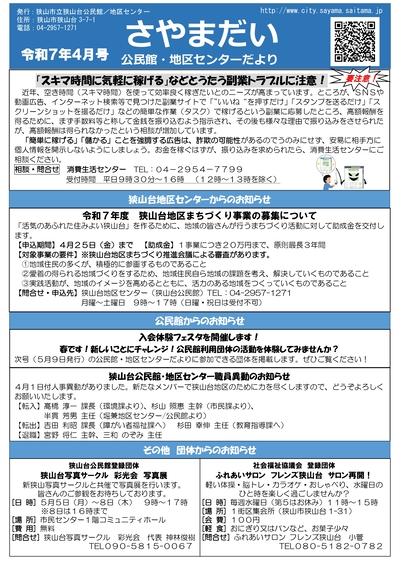 消費者ホット情報、令和7年度狭山台地区まちづくり推進事業の募集について、入会体験フェスタのお知らせ、職員異動のお知らせ、狭山台写真サークル彩光会写真展のお知らせ、ふれあいサロンフレンズ狭山台再開のお知らせ