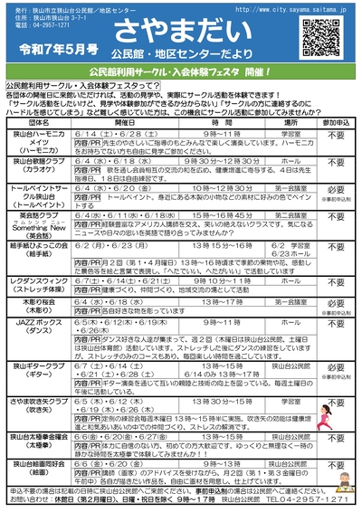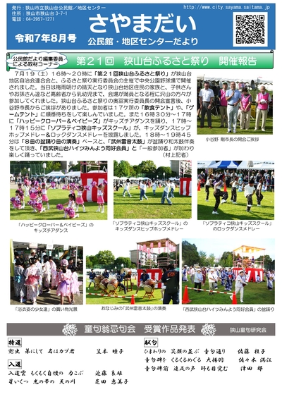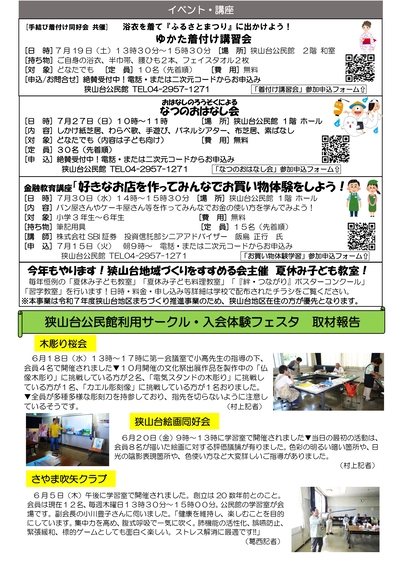 なつのおはなし会参加者募集、浴衣を着て『ふるさとまつり』に出かけよう!ゆかた着付け講習会参加者募集、金融教育講座「好きなお店を作ってみんなで買い物体験をしよう!」、狭山台地域づくりをすすめる会主催令和7年度狭山台地区まちづくり事業参加者募集、狭山台公民館利用サークル・入会体験フェスタ取材報告第一弾