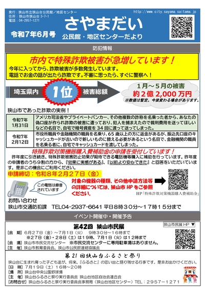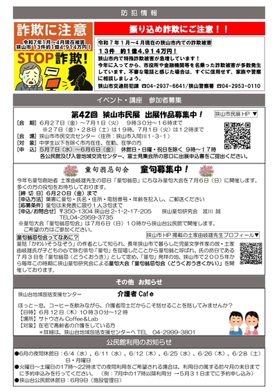 防犯情報「振り込め詐欺にご注意!」、第42回狭山市市民展出展作品募集、童句翁忌句会童句募集、介護者cafe参加者募集、公民館利用のお知らせ