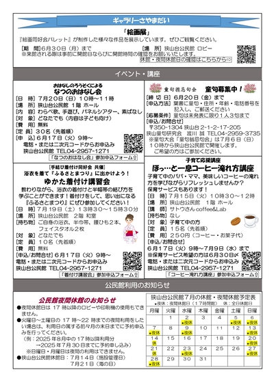 ギャラリーさやまだい作品展示のお知らせ、なつのおはなし会参加者募集、童句翁忌句会童句募集、浴衣を着て『ふるさとまつり』に出かけよう!ゆかた着付け講習会参加者募集、ほっ...と一息コーヒー淹れ方講座参加者募集、公民館利用のお知らせ