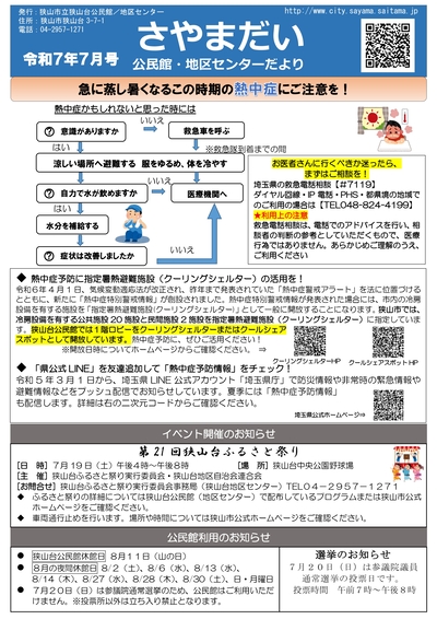 熱中症対策、第21回狭山台ふるさと祭り、公民館利用のお知らせ