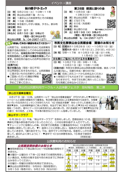秋の親子リトミック参加者募集、第28回朗読と語りの会参加者募集、参加してみたい講座を教えてください!募集、市民文化祭狭山台公民館会場開催のお知らせ・ボランティア募集案内、狭山台公民館利用サークル・入会体験フェスタ取材報告第二弾、公民館利用のお知らせ