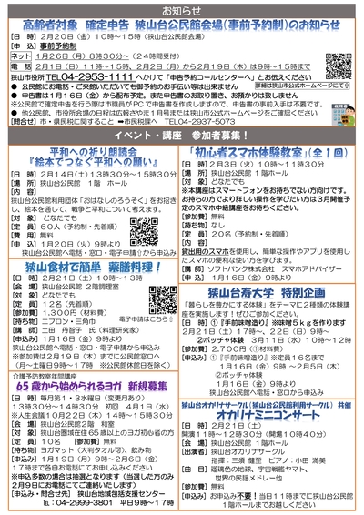 出張確定申告(事前予約制)のお知らせ、初心者スマホ体験教室参加者募集、平和への祈り朗読会「絵本でつなぐ平和への願い」参加者募集、狭山台寿大学特別企画「手前味噌造り」「ボッチャ体験」参加者募集、狭山食材で簡単薬膳料理参加者募集、オカリナミニコンサート開催のお知らせ、65歳から始められるヨガ新規募集