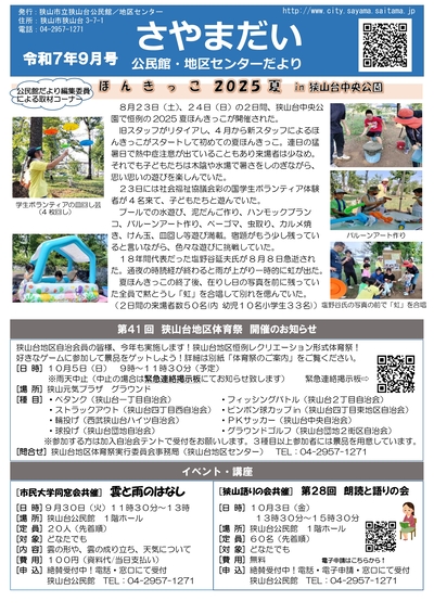 【表面】「ほんきっこ2025夏」開催報告、第41回狭山台地区体育祭開催のお知らせ、雨と雲のはなし参加者募集、第28回朗読と語りの会参加者募集