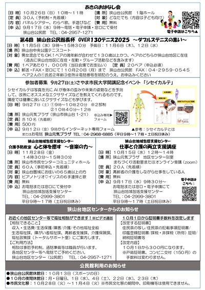 あきのおはなし会参加者募集、第4回狭山台公民館長杯over130テニス2025~ダブルテニスの集い~参加者募集、さやま市民大学開講記念イベント「シセイカルテ」参加者募集、心と体を癒す~音楽の力~参加者募集、仕事と介護の両立支援講座参加者募集、狭山台地区センターからのお知らせ、公民館利用のお知らせ