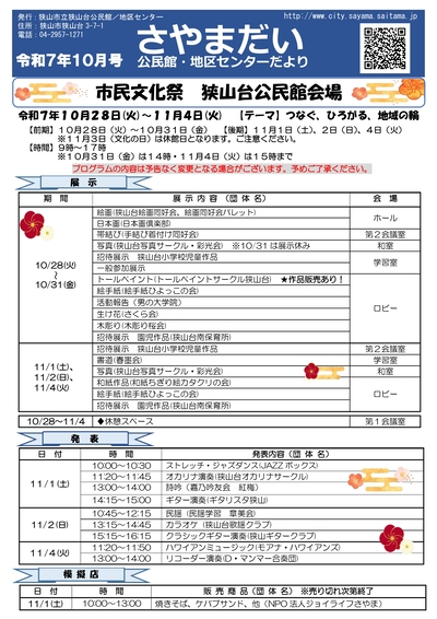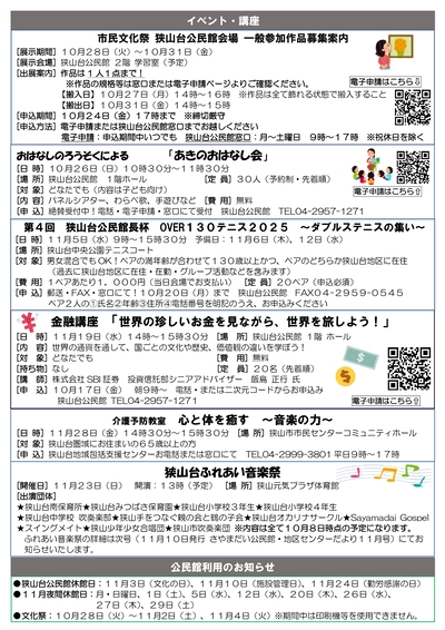 市民文化祭狭山台公民館会場一般参加作品募集案内、あきのおはなし会参加者募集、第4回狭山台公民館長杯over130テニス2025~ダブルテニスの集い~参加者募集、金融講座「世界の珍しいお金を見ながら、世界を旅しよう!」、心と体を癒す~音楽の力~参加者募集、狭山台ふれあい音楽祭開催のお知らせ、公民館利用のお知らせ