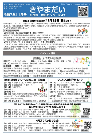 狭山市防災訓練(狭山台地区)訓練のお知らせ、狭山台ふれあい音楽祭お知らせ、語り部グループななこ会口演会、クリスマス親子リトミック参加者募集、森の木の実でクラフトを楽しもう!参加者募集、クリスマスおはなし会参加者募集