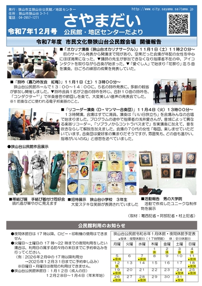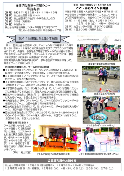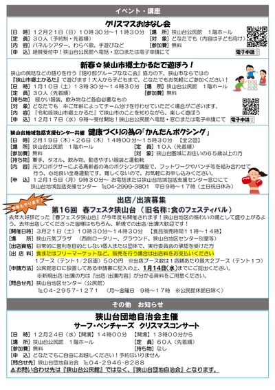 クリスマスおはなし会参加者募集、新春狭山市郷土かるたで遊ぼう参加者募集、健康づくりの為の『かんたんボクシング』参加者募集、第16回春フェスタ狭山台(旧名称食のフェスティバル)出店出演募集、狭山台団地自治会主催「サーフ・ベンチャーズクリスマスコンサート」