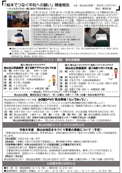平和への祈り開催報告、狭山台公民館長杯第13回グラウンドゴルフ大会参加者募集、狭山台公民館長杯第14回ペタンク大会参加者募集、60歳からの『気分爽快!ヒップホップ♪』参加者募集、令和8年度狭山台地区まちづくり事業の募集について(予定)、4月公民館休館日・夜間休館日のお知らせ